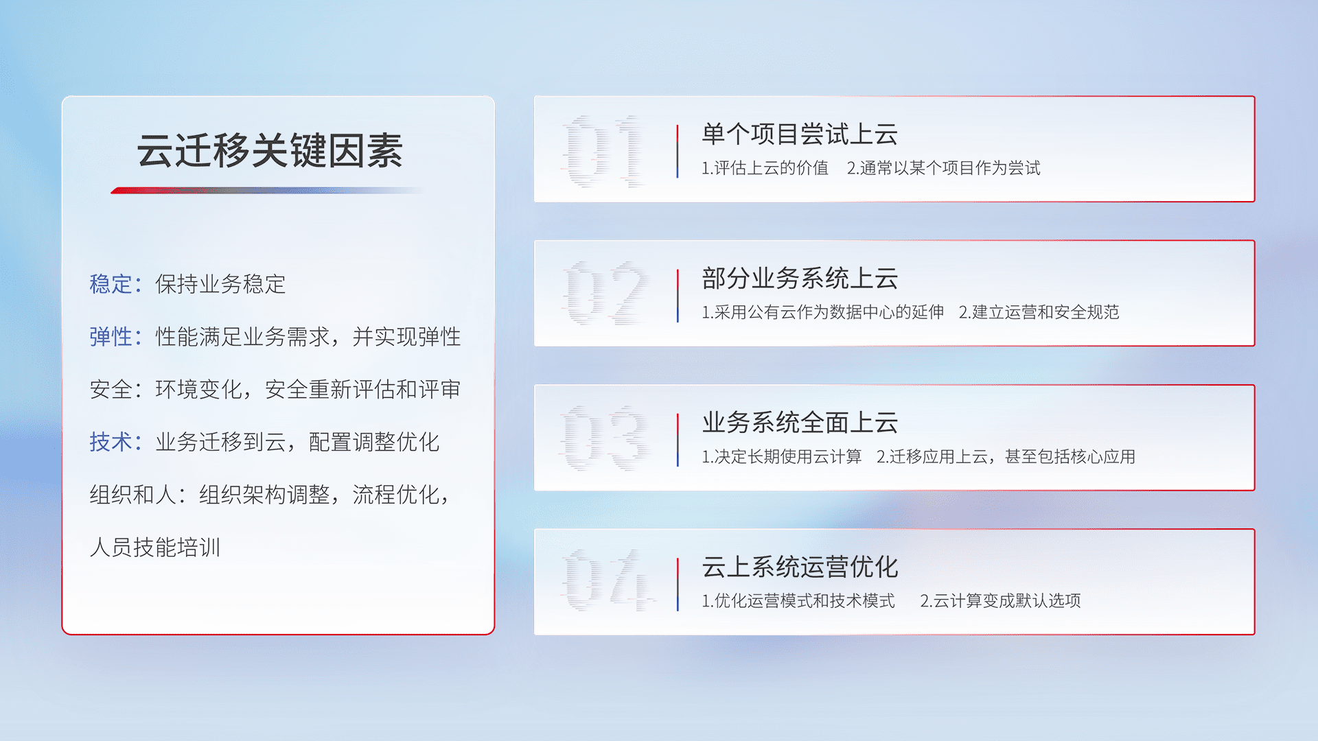 结合实际业务,,从规划设计、、、、云平台选型、、、云原生改造、、、数据迁移、、、集成交付,,迁移全过程为客户识别最佳上云路径,,,,做好风险识别管理,,,,设计网络架构、、身份权限、、、、安全审计合规、、、、操作审计、、日志审计、、监控告警策略、、、多站点容灾设计等,,对云上基础设施进行整体规划,,,提升IT治理水平,,,以满足弹性、、高可用、、、高性能的需求。。