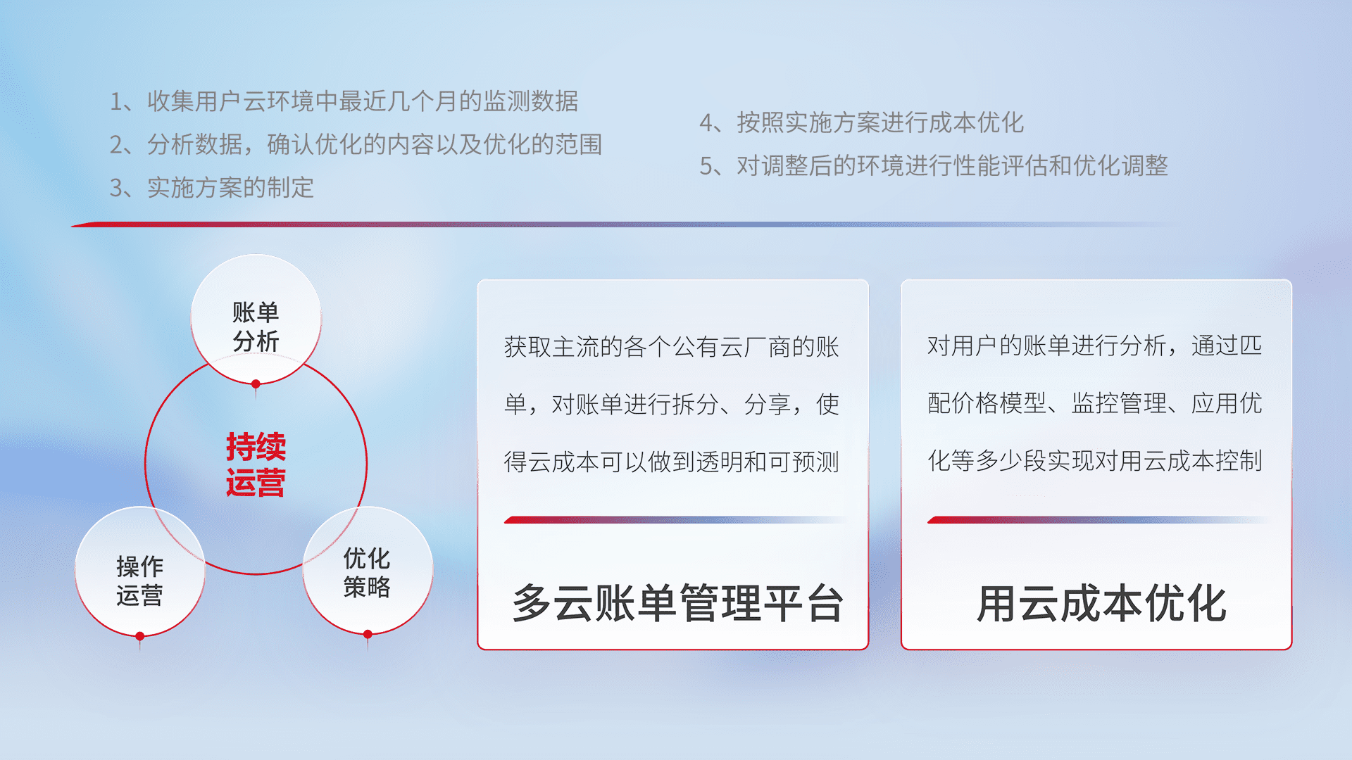 通过多云纳管,,,,以统一的资源数据模型把客户的云资源进行抽象和封装,,,进而实现对多云资源的统一操作,,,,保障云资源管理的可靠性、、、、稳定性与可用性。。量身定制化运维内容,,配置、、开发运维、、、补丁管理、、、、备份、、监控、、、认证和访问管理、、审计和日常巡检等,,,保障在用云过程中的可靠度,,,稳定度以及高可用率。。。